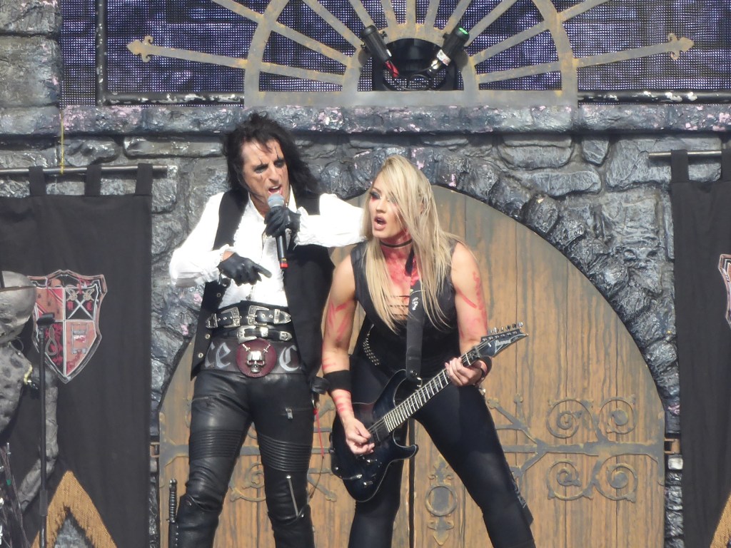 Er zijn van die bands en artiesten die je gewoon een keer gezien wilt hebben. Alice Cooper stond nog op mijn lijstje, want daar hoor ik altijd goede dingen over. Hij brengt een happy horror show mee met een fraai decor van een waar horror kasteel. Cooper brengt zijn rock muziek met veel show en vol theater. Soms vraag je je af of je niet naar een musical staat te kijken. Het is wel allemaal erg Amerikaans met veel gevoel voor show maar ook behoorlijk overdreven. Zo gaat zijn band, met niet de minste muzikanten, door alle bestaande rock poses waarbij heel stoer wordt gekeken. Cooper heeft natuurlijk wel gewoon lekkere rock nummers gemaakt met een paar flinke hits. Die passeren uiteraard ook vandaag, waarbij soms alle theater registers open gaan. Zo banjert er een uit de kluiten gewassen baby rond tijdens ‘Billion Dollar Babies’ en verliest Cooper zelf zijn hoofd in de guillotine tijdens ‘I Love the Dead’. Uiteraard wordt er afgesloten met zijn grote hit ‘School’s Out’ waarin ook nog een stukje ‘Another Brick In The Wall Pt. II’ van Pink Floyd wordt verweven. Het zit allemaal erg goed in elkaar, ook al is het muzikaal niet het allerspannendst. Maar het is wel een spektakel en daardoor zeker de moeite waard.
