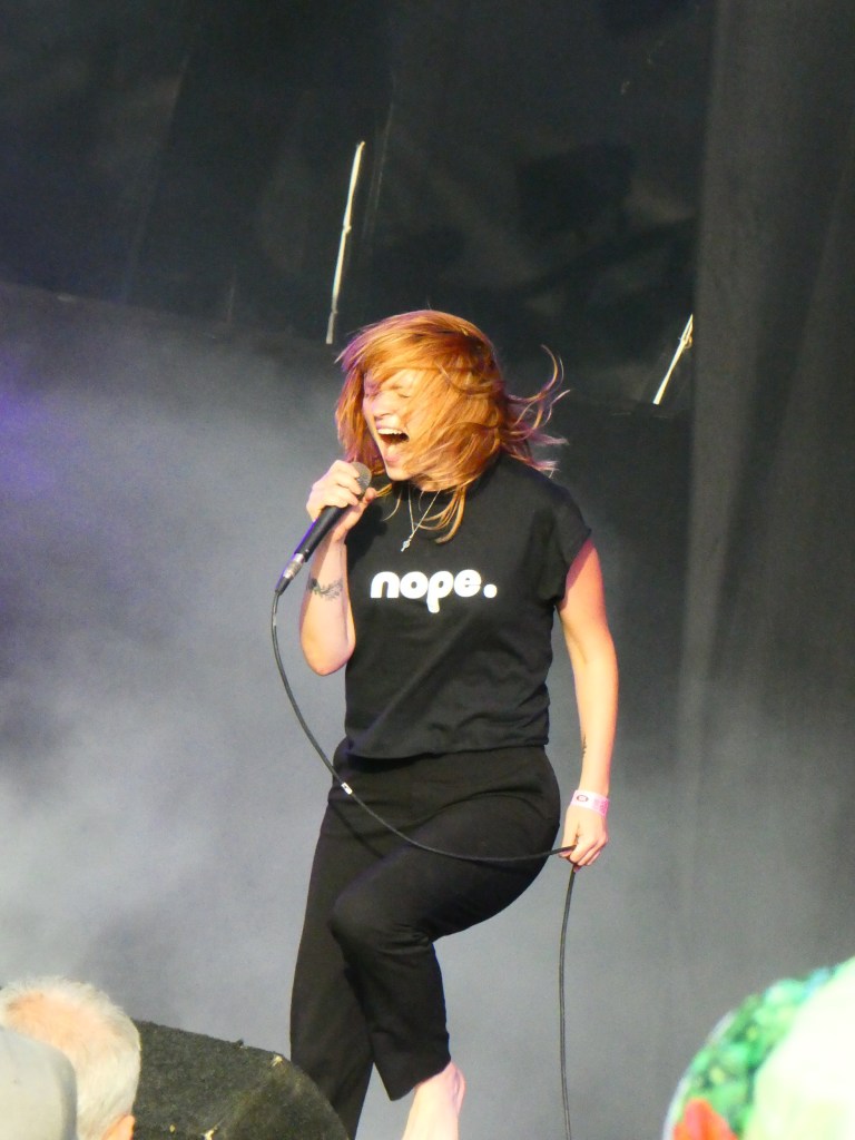 Na een hoognodig frietje stoofvlees wandelen we maar eens richting The Slope, dat in de loop der jaren tot volwaardig podium is uitgegroeid. Daar staat Billy Nomates op te treden, die onlangs nog een berg narigheid over haar uitgestort kreeg door haar optreden op Glastonbury, doordat ze niet met een band speelt. Ook vandaag staat ze in haar eentje op het podium en staat daar haar stinkende best te doen. Ze zingt krachtig en haar stem heeft soms wel wat weg van Melissa Etheridge. De popliedjes steken prima in elkaar en in haar eentje weet ze genoeg levendigheid op het podium te etaleren. Ik zie ook graag een performer met band optreden, maar om daar iemand op social media het leven voor zuur te maken slaat echt nergens op. Vooral als ze verder ook nog eens een prima optreden verzorgt en laat horen niet voor niets op deze festivals te staan.