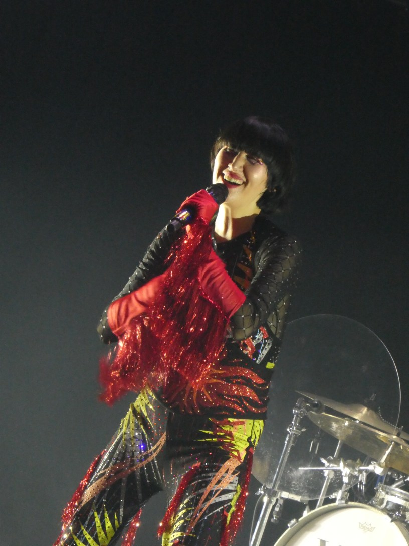 In het middelpunt staat de altijd stralende Karen O, die in een sprankelende outfit over het podium beweegt. De charismatische zangeres is immer goed geluimd en ook vanavond is ze een en al vrolijkheid. Haar wat geknepen stem klinkt helder en het lijkt haar geen enkele moeite te kosten. Helaas is het totale geluid wat vlak, zodat de nummers net niet fel genoeg door de speakers knallen. Iets later op de avond lijkt het wat beter, maar de grote hits als ‘Zero’, ‘Gold Lion’ en ‘Heads Will Roll’ klinken daardoor minder overweldigend. Toch missen ze hun uitwerking niet en vliegen er twee grote oogballen door de zaal tijdens ‘Zero’. Tot groot vermaak van de zaal en Karen O volgt het publiek de aanwijzingen van roadies om de ballen naar de achterkant van de zaal te bewegen, pas na een tijdje op. Vooral tijdens ‘Heads Will Roll’ gaat de zaal helemaal los. Meerdere malen gaan er confettikanonnen af maar tijdens dat nummer gaan confettisluizen goed open en wordt Paradiso voorzien van een winterse look. Ik weet niet of de schoonmakers daar ook zo blij van worden.